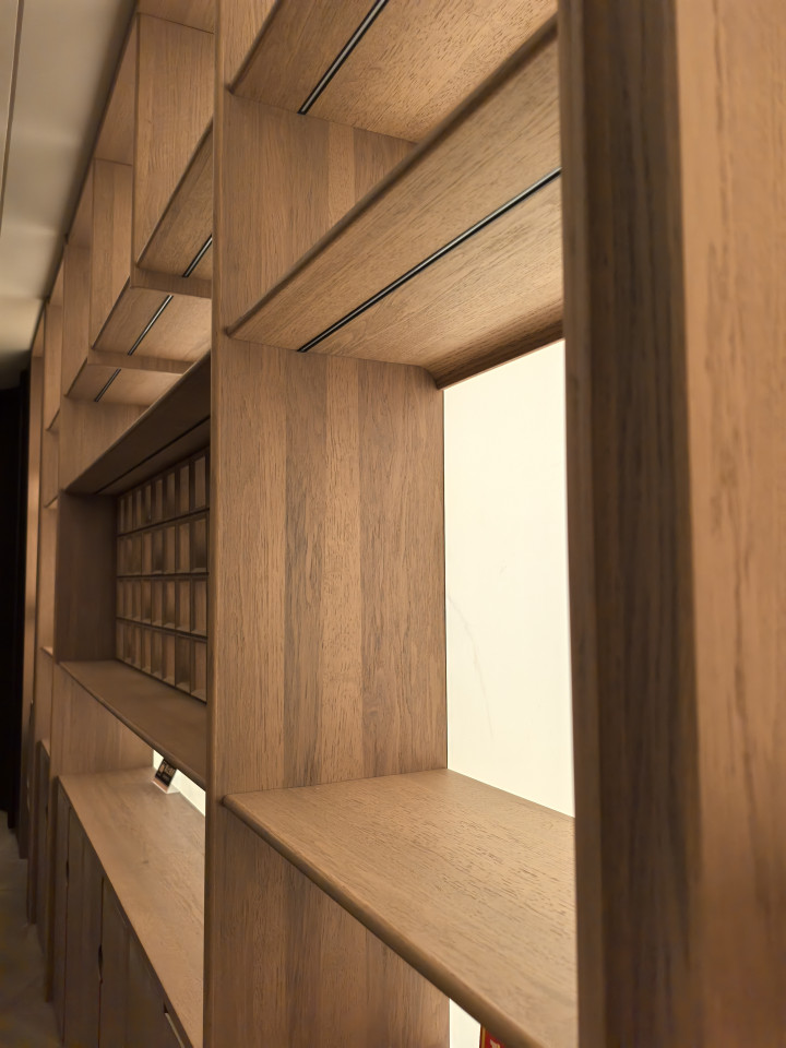 将散落的元素——墙板、柜体、木门、梁柱、线条……都融为一个完整的有机体。大面积统一的材质、统一的色彩、统一的设计语言,共同塑造出一个极度和谐、宁静且高级的空间氛围。告别东拼西凑的割裂感。