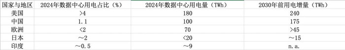 表1:按国家划分的数据显示:2024年数据中心用电量(占比与绝对值),以及到2030年的用电增量